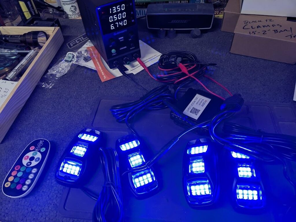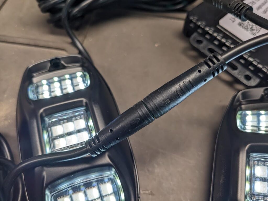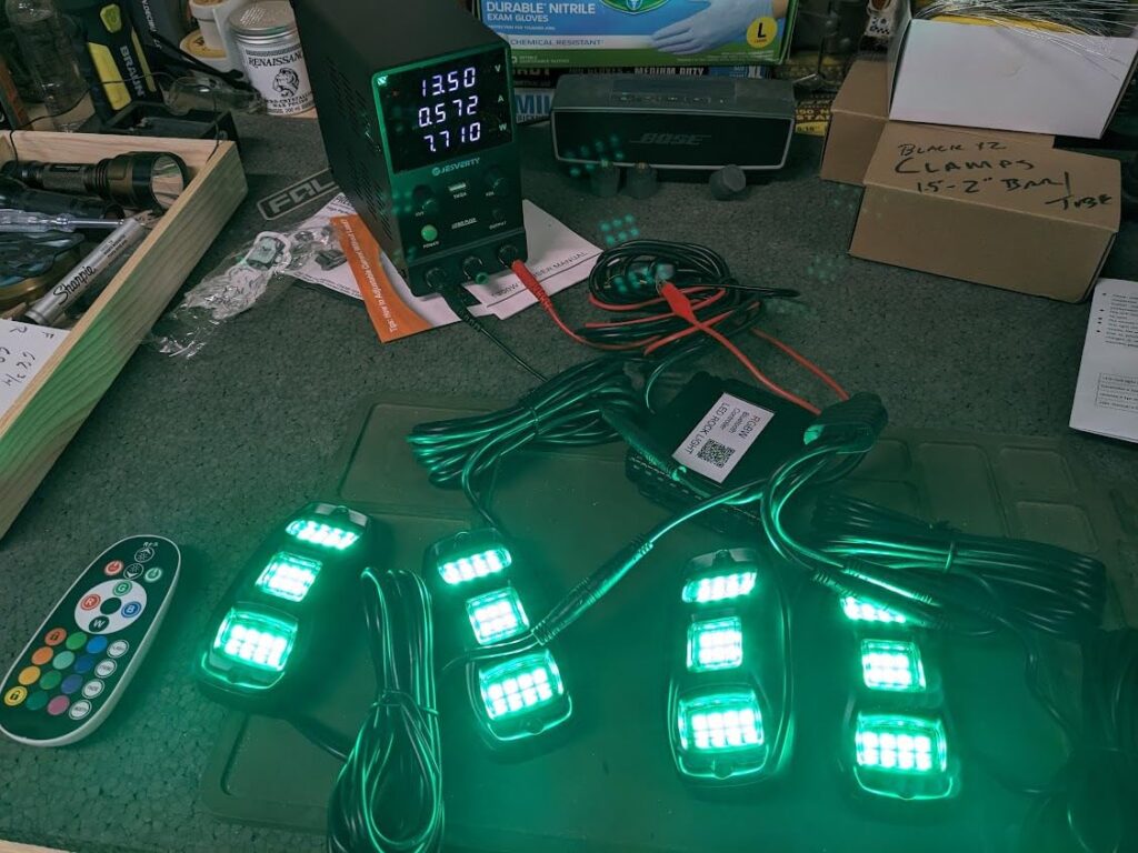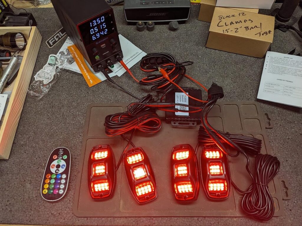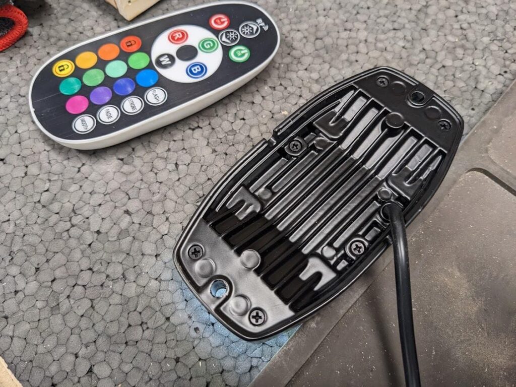 This is a nice set of four RGBW lights with a decent spread of light. Each pod has three sections aimed down and off to each side for a fairly wide angle of coverage. The light lenses are poly-carbonate and they’re set in an aluminum housing with a powdercoat finish. The wires are allowed to come out from under the light on the sides and this allows for flat mounting. Each of the four lights come with a rubber-like mounting pad but the backside is curved for a tubing mount. They can be mounted without the pad. I’ve mounted these in the past using neodymium magnets instead of bolts to the body and this has worked well as an alternative. The colors are a bright and fairly true Red, Green and Blue. The white is comprised of all of the LEDs color when in any mode other than White by itself at full power. Then it’s really bright and a true white. White in a lower setting only draws about 0.7 watts. In full white, or in RGB, the draw is over 7 watts. The wiring harness is intuitive to use; power and ground, a fuse and an on/off switch. The provided remote does not come with the required two AAA batteries. There is no key fob remote, but there is a phone app. If you’re a regular rock crawler and do runs at night you’ll appreciate the white and yellow colors varying on the darkness and how you protect your night vision. All in all, it’s a nice package if you only need four light pods but at $19 a light there are other less expensive options. Otherwise, I like them.