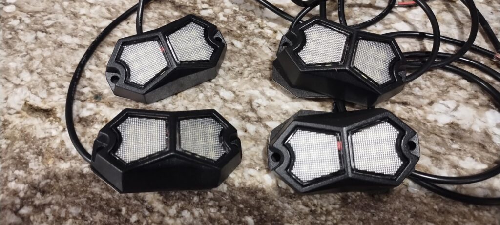 These rock lights put out a wide beam of bright white light. Aluminum housings are good quality. Look and feel durable. The kit does not include a wiring harness, which would have been nice at this price point.